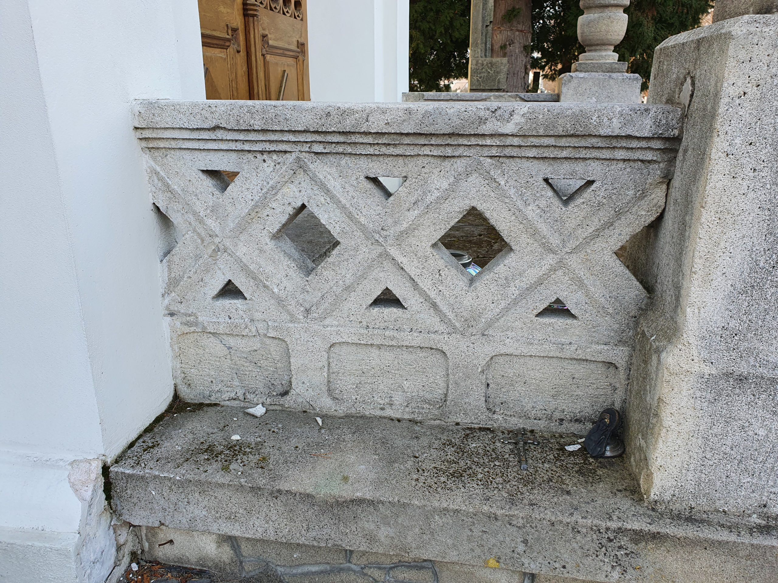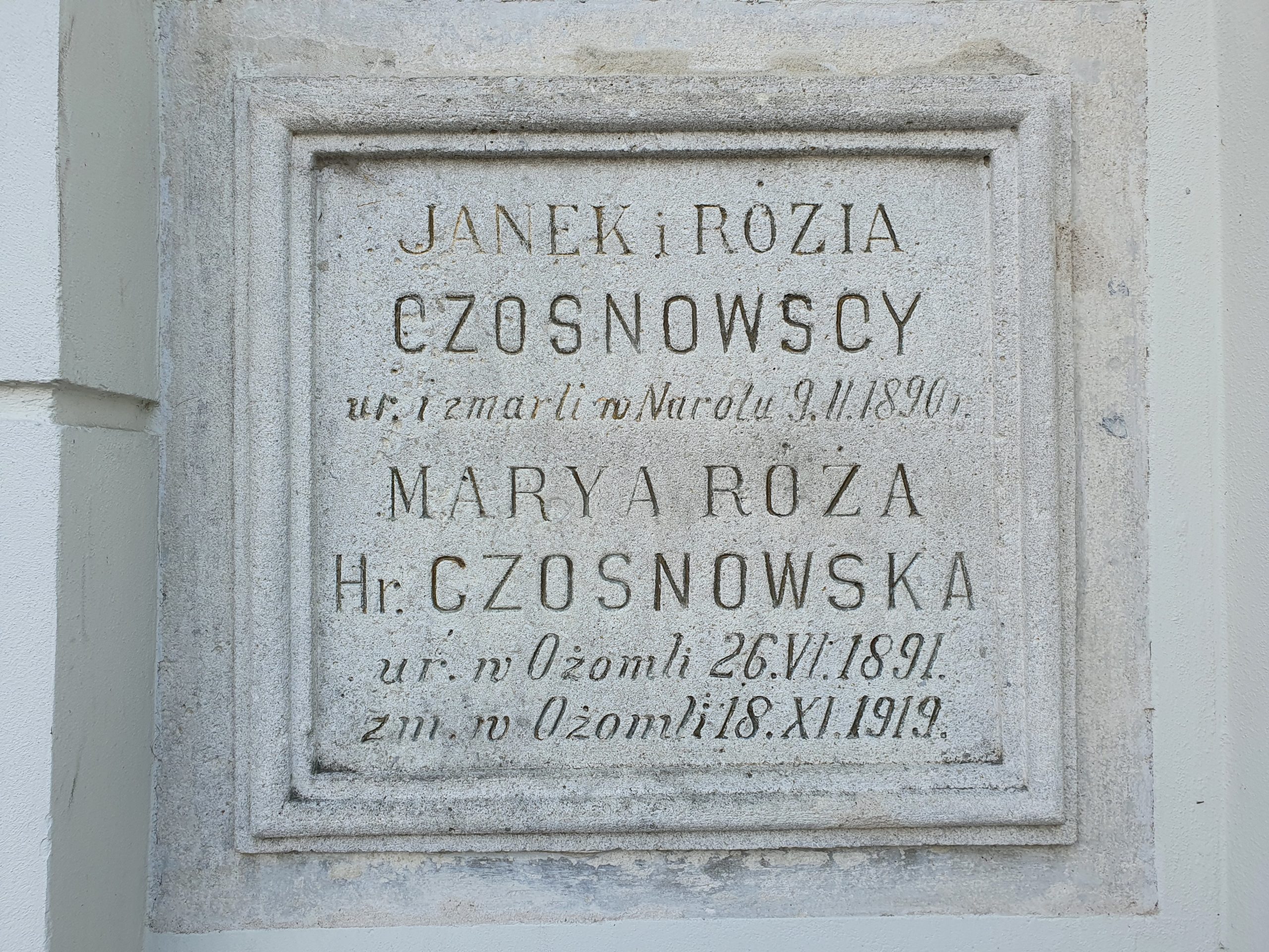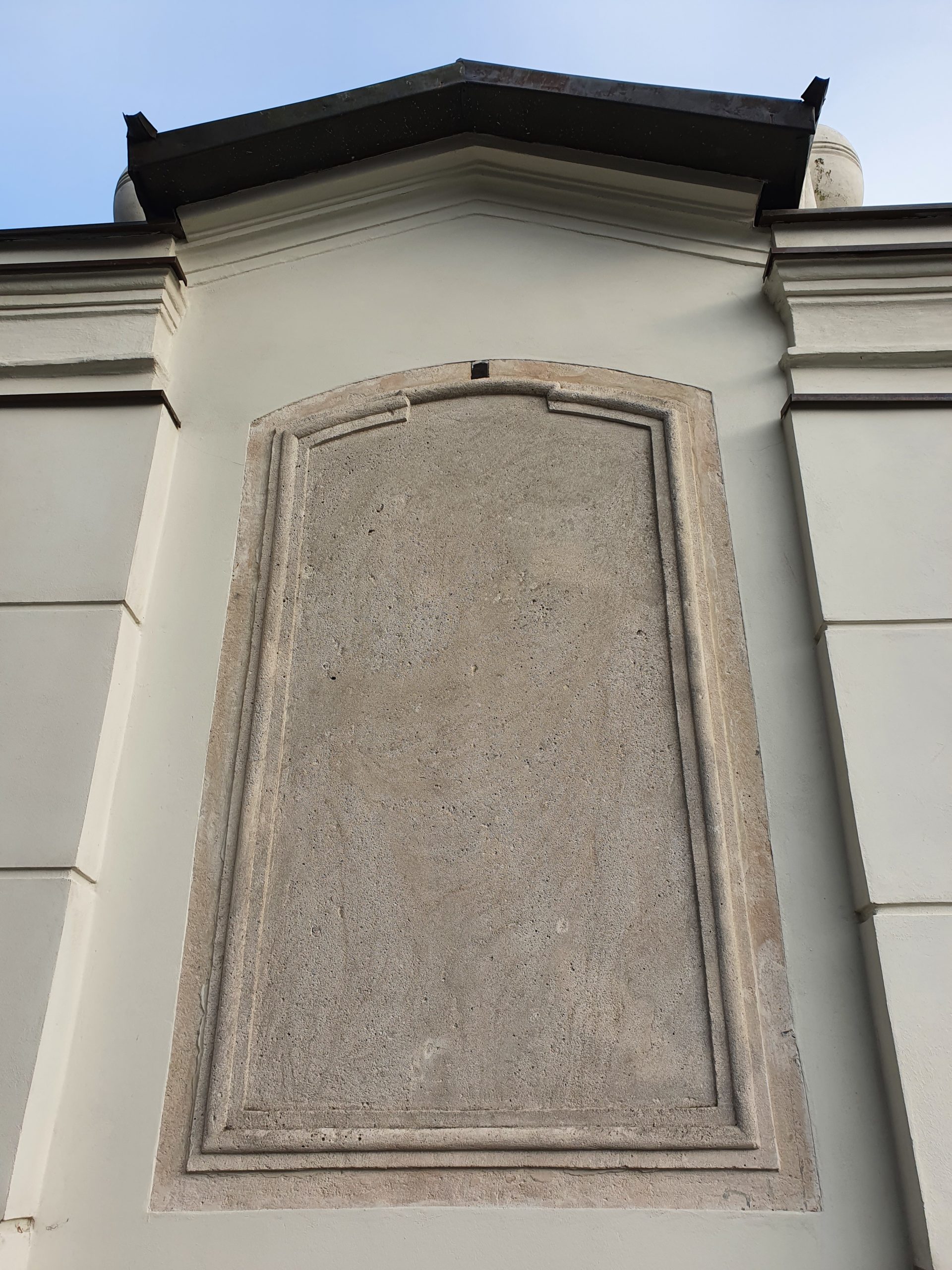 Jeden z niewielu słupów ogrodzeniowych, który ma ozdobę w formie koła na szczycie. Kiedyś niektórzy snuli przypuszczenia, że jest to nagrobek tatarski, bo obłupany okrąg przypominał półksiężyc. Obecnie, pęknięty słup przyjął rolę stopnia przed wejściem. Istnieje możliwość, że była to płyta nagrobna z dziurą na czop małego krzyża.